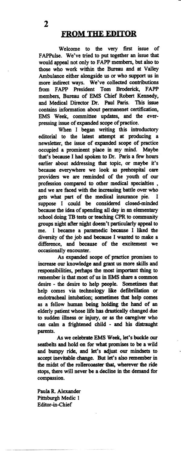 FAPPulse • 21st June 2023 FAPPulse editorial This editorial is from Vol. 1, Issue 1 of the union newsletter, FAPPulse. The issue commemorates EMS Week.