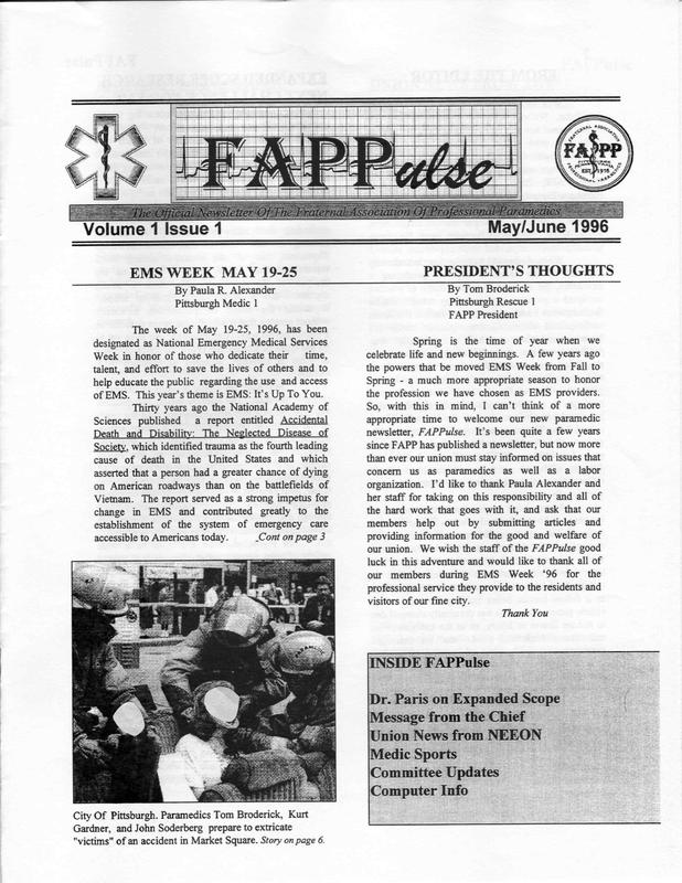 FAPPulse • 21st June 2023 FAPPulse, Vol. 1, Issue 1, May/June 1996 Front page first issue of the union newsletter. I served as editor-in-chief. FAPP is the Fraternal Association of Professional Paramedics. Patients' faces in the photo have been obscured.